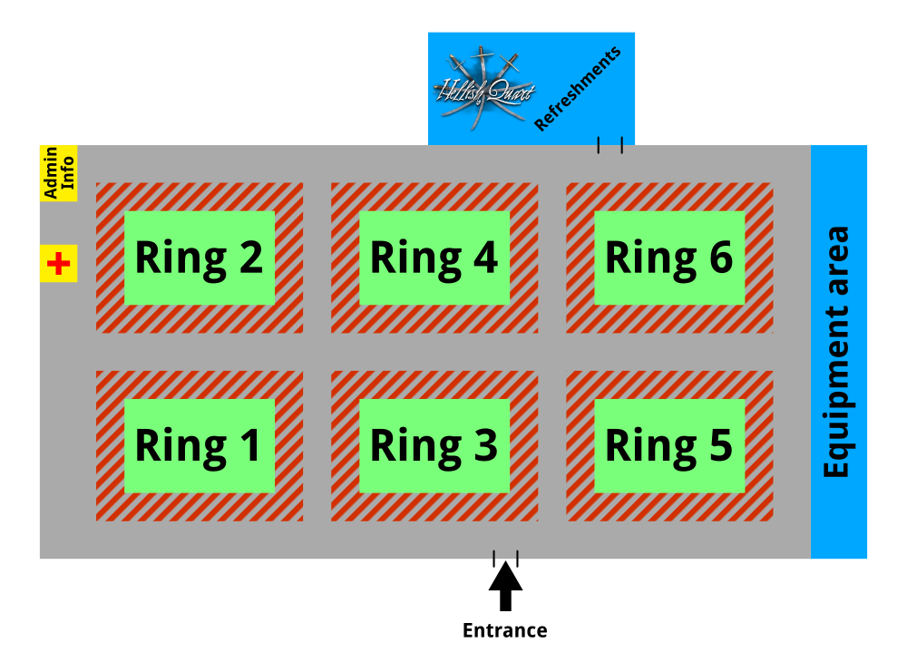 Plan of the distribution of rings and other points of interest around the hall. Equipment area is the primary area, where you can put down your stuff (except for the cloakrooms). Please use this area as much as possible, and bring only the essential stuff you need for your performance to the vicinity of the rings. In the corner with the Hellish Quart logo you can play this game ;-)