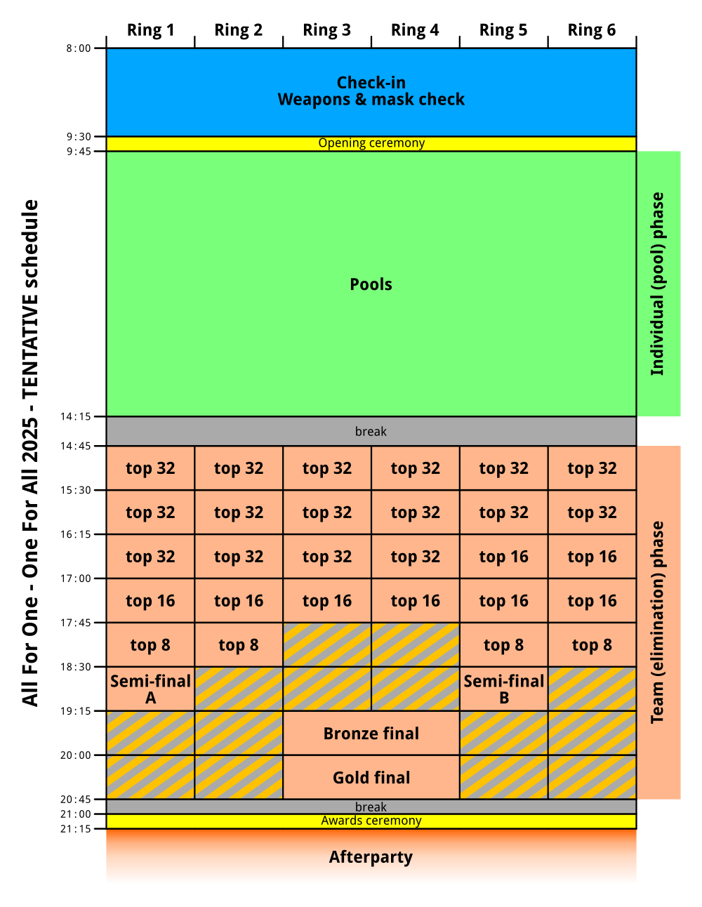 Time of check-in and weapon+mask check is fixed, everything that follows will go according to the flow of the tournament, i.e. it may happen both sooner and later than scheduled. We hope to stick to the schedule as much as possible.